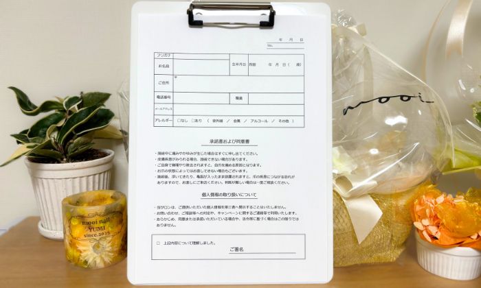 カルテを参考にしながら、爪のお悩みやご希望などお伺いします。
