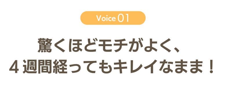 子育て中でなかなか自分のことに時間が割けない中、4週間以上も綺麗な爪のまま過ごすことができて嬉しいです。